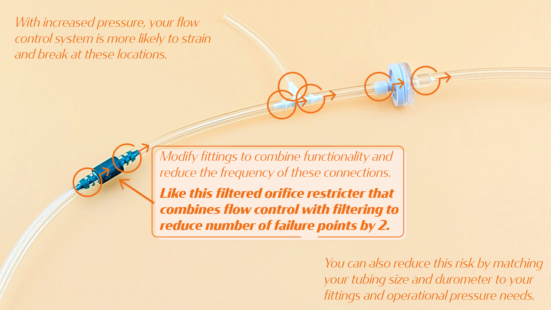Fitting modifications sometimes take the form of orifice insertion. In other words, you take a fitting that otherwise works with your tubing or other system connection needs but is too large to effectively toggle the pressure. Then you make it smaller by drilling a precisely measured hole into a piece of plastic that you then insert into the fitting. Now provided you are administering enough overall pressure, then pressure fluctuations on one side come out at a consistent and carefully calibrated rate on the other.