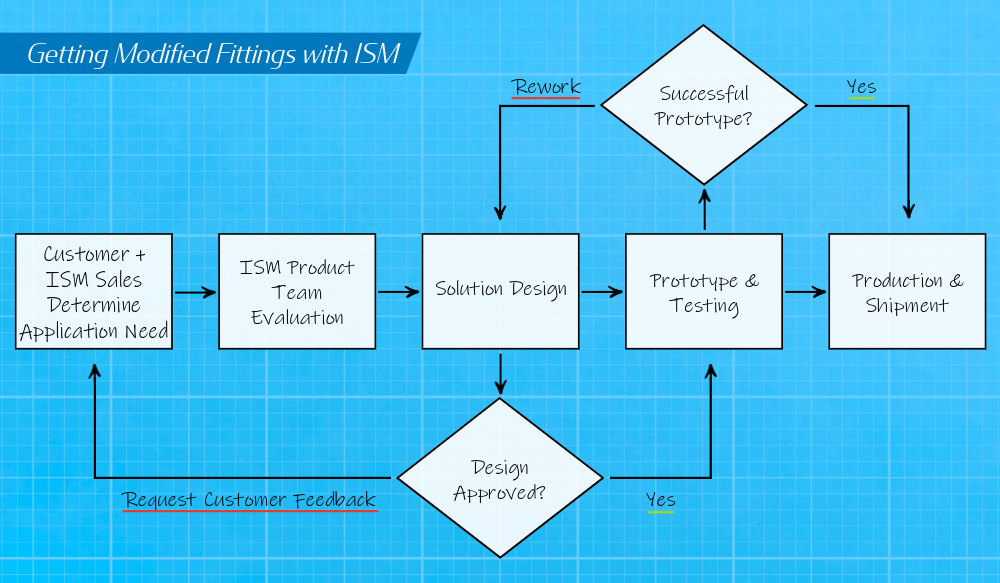That’s where you turn to a supplier like ISM, who not only lists standard and modified fittings, but has a reliable process for fielding new needs and designing solutions to meet them. From the initial sales discussion through shipping, we help customers articulate their needs and design the right solution. We then assemble it ourselves.