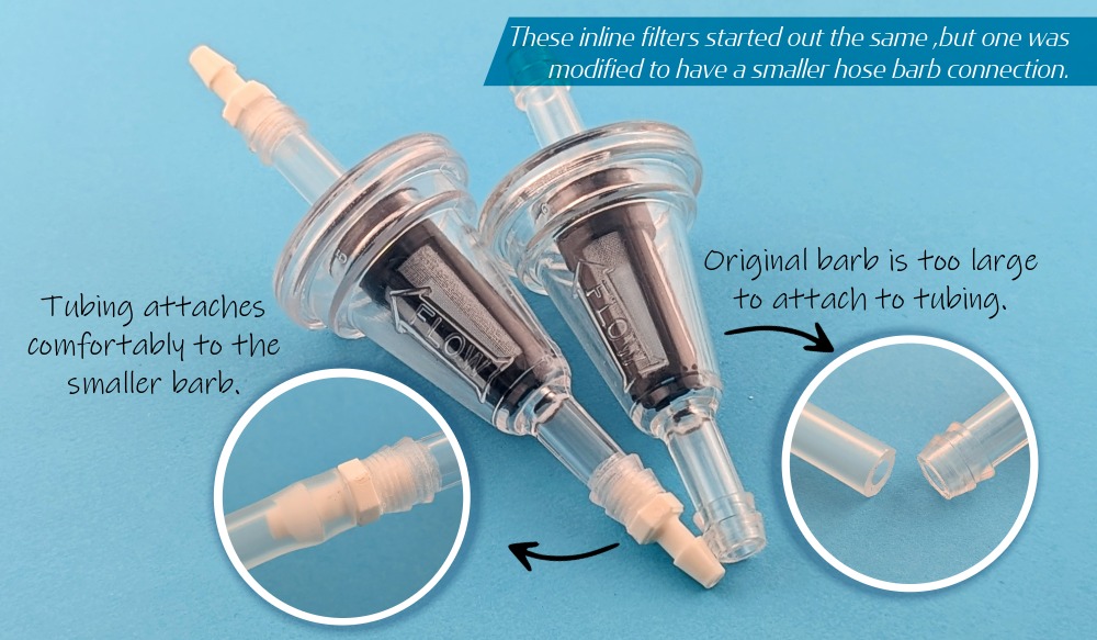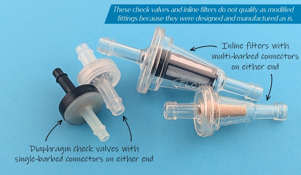 However, things get complicated when you have check valves and inline filters that also have these types of connections. A check valve with hose barb connections on either side, is both a check valve and a fitting. This is also true of filters designed for inline filtration.