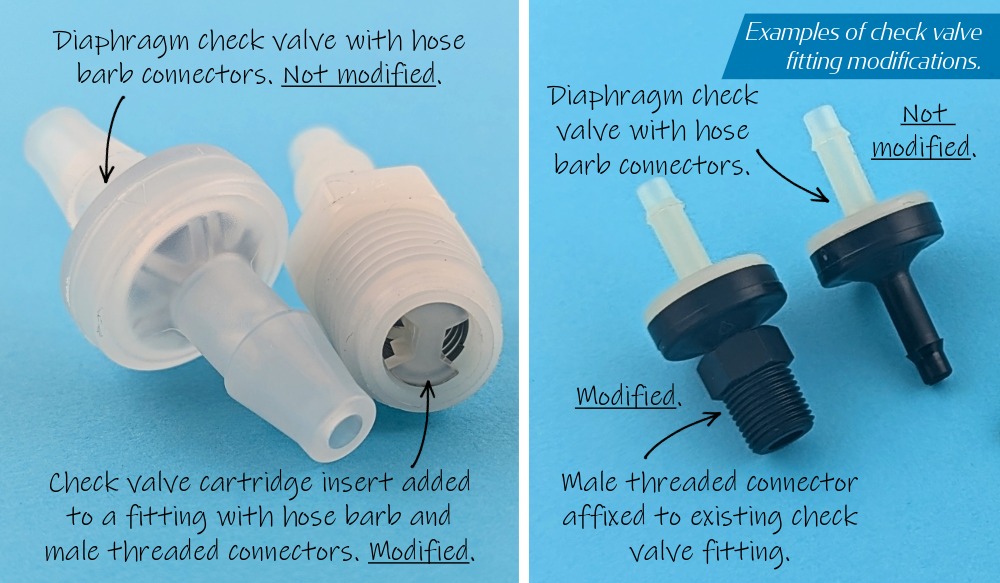 Ah, you’re thinking, this must be an example of the modified fittings that you speak of. Not quite. You see, a check valve that is designed and manufactured from the ground up to include hose barb connectors like those pictured above is not considered modified. They are manufactured fittings with integrated check valves. A modified fitting is defined by some sort of post-manufacturing modification. In other words, the out-of-the-box component does not quite do what you need it to do, so you change it. In the case of a check valve, you add a check valve cartridge to a fitting that did not previously have one or you modify the connectors on your existing check valve fitting.