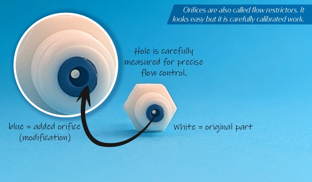 Orifice insertion is a little different. You’re not dropping a cartridge in. You’re adding a hole to a plastic or metal component that is then pressed into the fitting. But before you bust out your drill and go to town, you’re not adding just any hole. You’re adding a precisely measured and situated hole to help control the flow of air through your system. This hole serves to restrict flow as air enters and makes it easier to predict pressure changes.