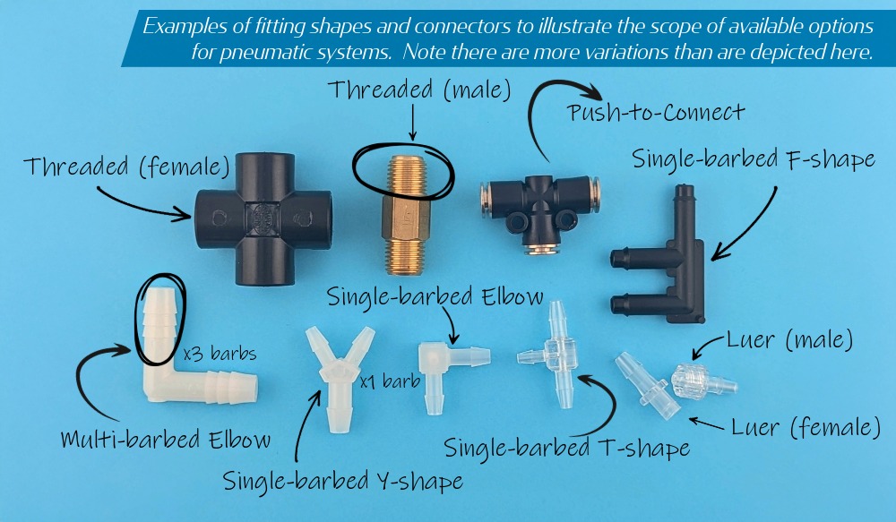 Let’s revisit your robotic arm. Your available check valves have single barb hose barbs on either side. Maybe they are too big for your tubing, but getting bigger tubing would add too much weight. Maybe you want more barbs for greater grip, but you can’t find the right kind of check valve with the right number of barbs. Maybe they’re just looking at you funny. But however, it happened, you’ve decided you need a different way for this check valve to connect those tubes. So, you add fittings on either side that connect comfortably to the check valve on one end and the tubing on the other. Easy peasy – if you have the right fittings.